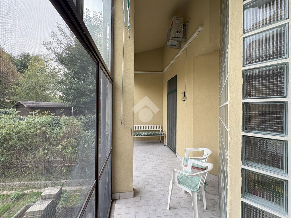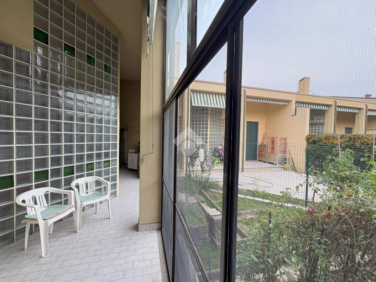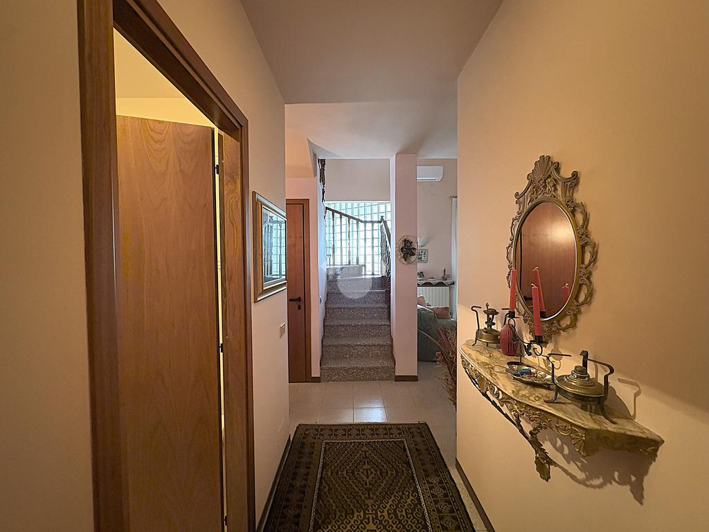 Gli ampi spazi esterni comprendono due porticati chiusi con zanzariere sia sul fronte che sul retro e un giardino privato, ideali per vivere momenti di relax all’aperto.